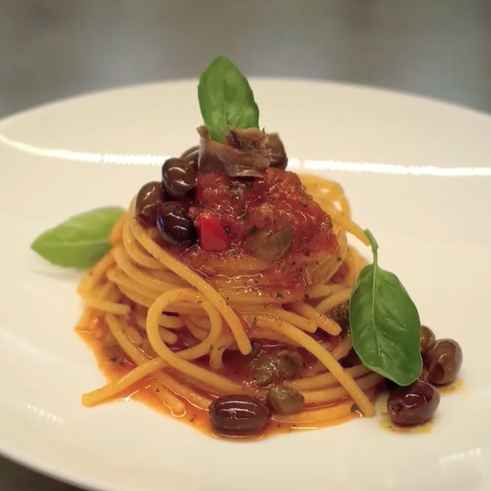 Add the Peeled Tomatoes, Capers, Riviera Olives and cook slowly for about 20 minutes.