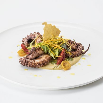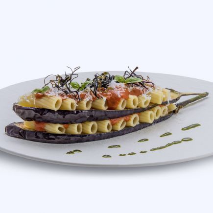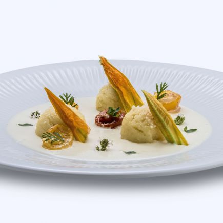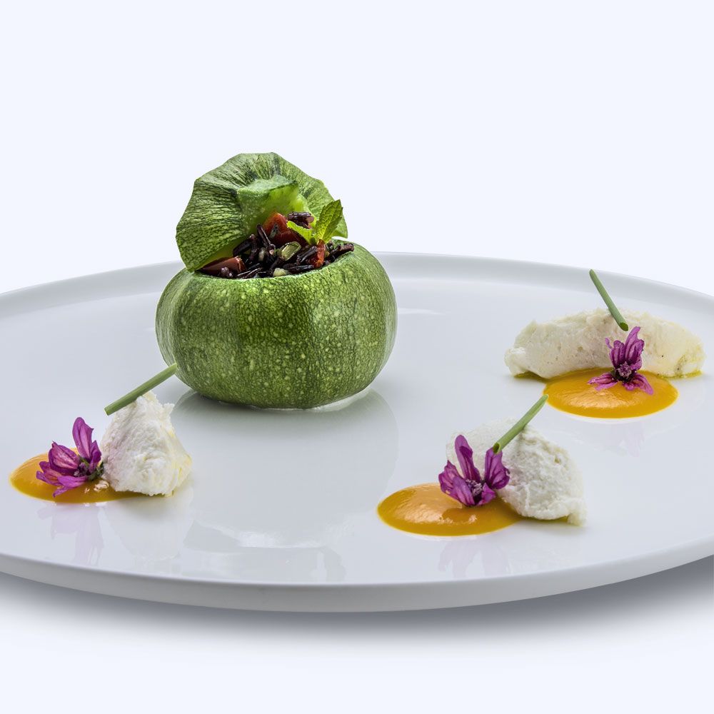 Clean and peel the aubergines, dice them and sauté them quickly in oil and garlic; add salt and fresh basil to taste at the end of the cooking time. Add the diced Rustic Tomatoes to the aubergines, extra virgin olive oil, basil, Artemide Black Rice and a dash of apple vinegar. In a small frying pan, heat some extra virgin olive oil and onion, add the Grilled Bell Peppers and sauté them quickly. Then add some fresh basil and emulsify the mixture by adding a drizzle of extra virgin olive oil. Wash the round courgettes and cut off the top, scoop out the inside and blanch them quickly in boiling salted water for 2 minutes, then cool in iced water. Fill the round courgettes with the previously dressed Artemide Black rice salad. Season the fresh goat cheese with oil, salt and pepper and make some classic quenelles. Arrange the stuffed round courgettes and the bell pepper sauce on the serving dish; top with goat cheese quenelles and garnish with chives.