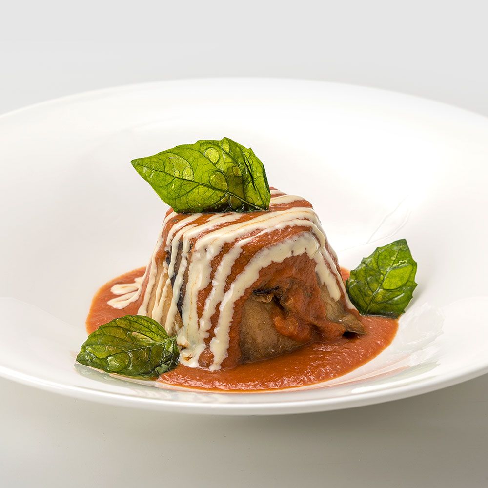 Wash and peel the aubergines, then cut them lengthways into 1/2 cm thick slices. Put the aubergines in a container and cover with milk. Sauté the extra virgin olive oil and onion in a saucepan, add the peeled tomatoes and a sprig of basil and cook for about 20 minutes; add salt to taste. Once the tomato is cooked, blend it coarsely. Bring the oil in the deep fat fryer to 175°C, drain the aubergines from the milk, coat them in flour and fry them in hot oil. Drain them on absorbent kitchen roll and once cooled, add salt to taste. Dice the Provola cheese. Distribute the aubergines in aluminium ramekin dishes, leaving a little space in the centre. Fill with diced Provola cheese, grated Parmesan cheese, fresh basil and tomato sauce; finish with a layer of aubergines and repeat with a second layer of filling to finish again with a layer of aubergines. Sprinkle with Parmesan cheese, drizzle with extra virgin olive oil and bake at 185/190°C for 8/10 minutes. Heat the cream with the agar agar to 85°C in a small saucepan, then add the Parmesan cheese, whisk and leave to cool. Arrange the single-portion parmigiana in the centre of the serving dish, garnishing with tomato sauce, crispy basil leaves and the Parmesan cheese sauce.