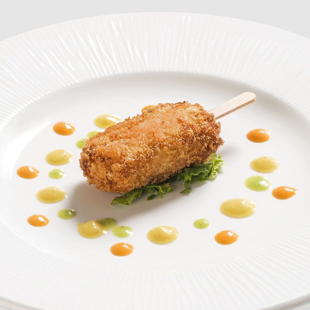De-salt the cod fillet and cut it into small pieces using a cutter. Cut the semi-dry Rustic Tomatoes into small pieces. Semi-whisk one part of the egg white. Add the finely chopped salt cod to the Rustic Tomatoes, marjoram, pepper and egg white and mix well. Pour the salt cod mixture into ice-cream moulds adding some small lollipop sticks. Fill to the brim without going over the edge, then bang the mould on the work surface to ensure no air bubbles remain inside. Put the moulds in the blast chiller and bring it to -18°C. Cut the green part of the courgettes into small pieces and blanch in boiling salted water, blast chill and emulsify with extra virgin olive oil to create a green sauce. Cut the bell peppers open, cut them into strips and separate the yellow ones from the red ones. In two small saucepans, mix extra virgin olive oil, onion and basil and sauté the bell peppers separately. Add a little water and some extra virgin olive oil and emulsify both bell pepper strips until two sauces are obtained. Cut the tramezzino sandwich bread using a pastry cutter. Remove the salt cod mousse from the moulds, dip them in the remaining semi-whipped egg white and bread it with the breadcrumbs prepared from the tramezzino sandwich bread. Fry the cod mousses in oil at 175°C until golden and crispy. Dry the fried mousses on absorbent kitchen towels, insert the wooden ice-cream sticks and lay them on the serving dish. Garnish with the bell pepper and the courgette sauces.