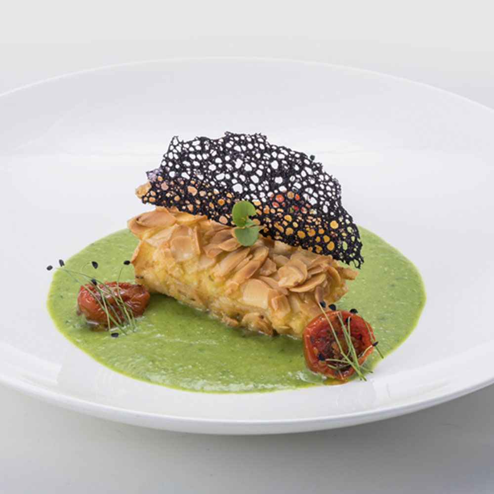 Dip the cod fillet in the tempura and then in the sliced almonds. Fry in hot oil at 175°C until golden brown.