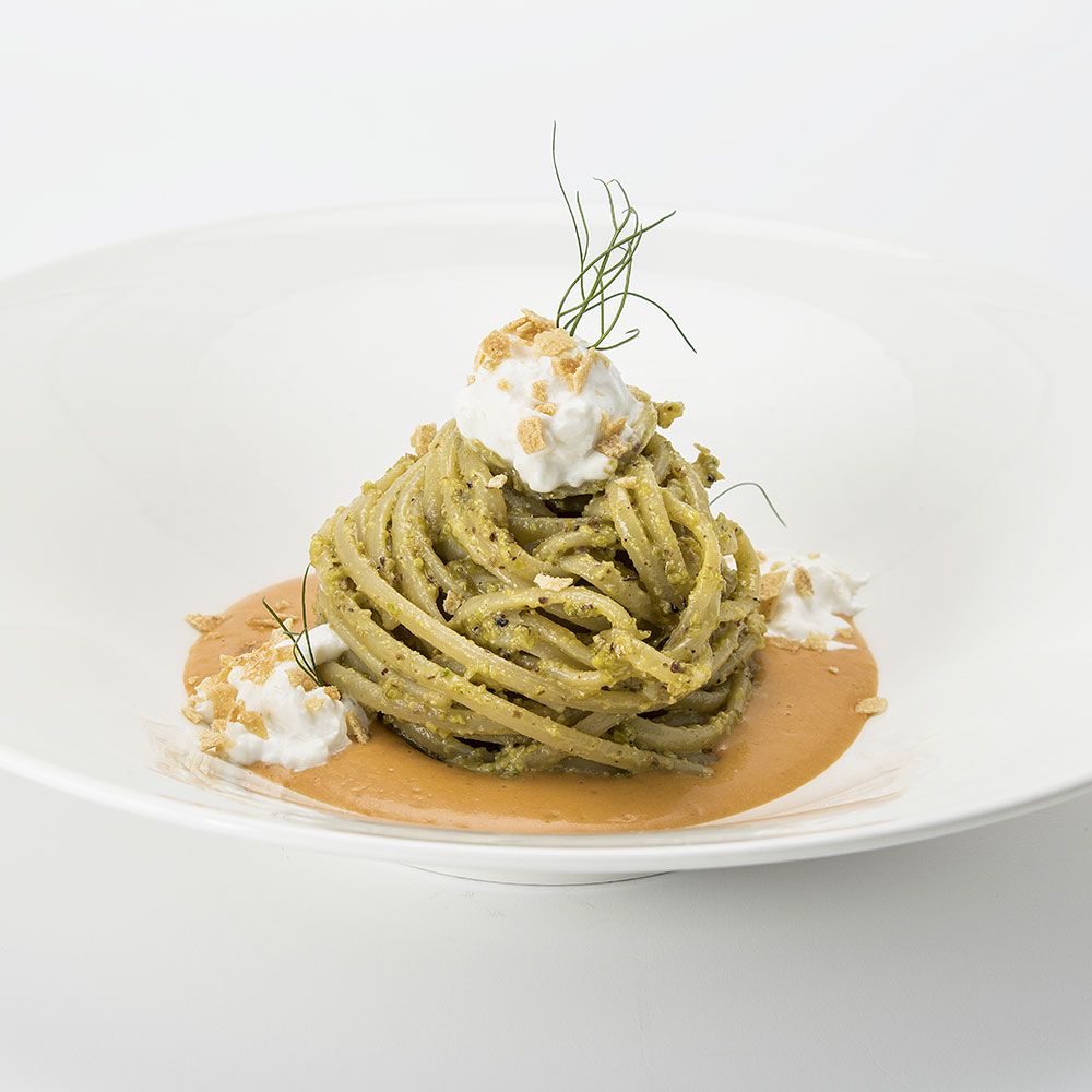 Coat the bottom of the serving dish with the shellfish sauce, arrange the nest of linguine on top and garnish with burrata cheese and crumbled breadsticks.