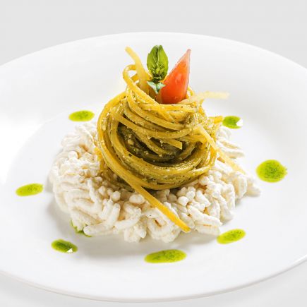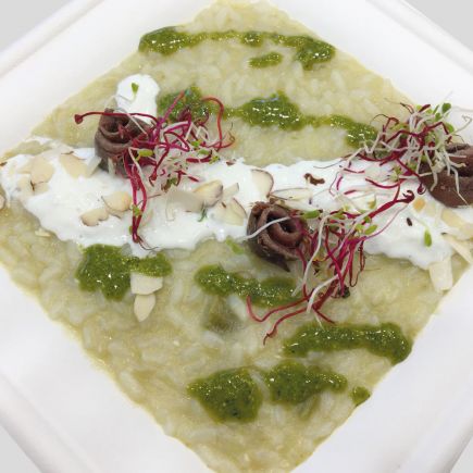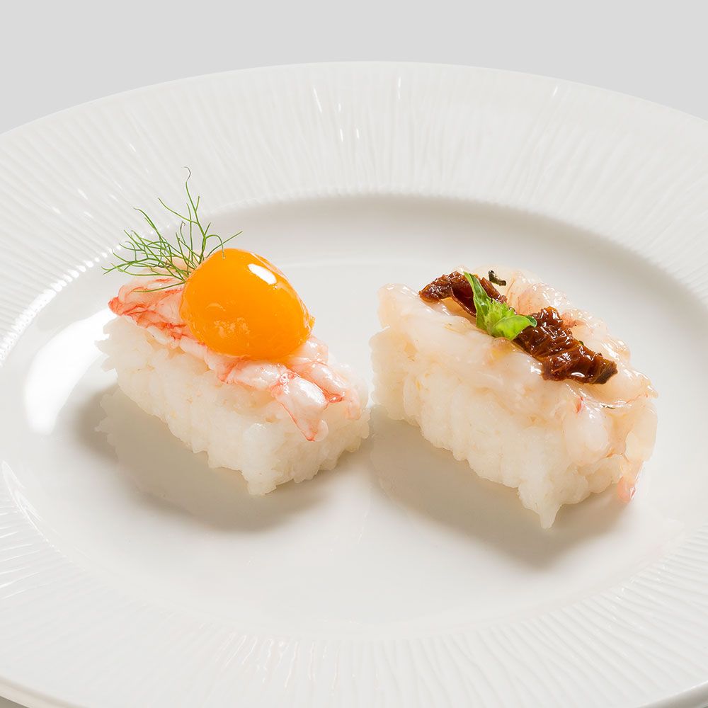 To prepare the prawns: Clean the prawns and scampi from their shells, then wash and dry them. Marinate the prawns in lemon juice, salt, pepper, brown sugar and herbs for about 10 minutes. Marinate the scampi in orange juice, salt, pepper and herbs for about 10 minutes. With the rice, make small rectangular tiles of about 20 grams each. Drain the semi-dried yellow cherry tomatoes and the sliced sun-dried tomatoes. Remove the shellfish from the marinade, dry it and make a central cut from the bottom upwards, but without splitting the shellfish in two, so as to give them an enlarged shape. Place the prawns on a rice tile and garnish with the semi-dried yellow cherry tomato. Lay the scampi on a rice tile and garnish with the Sun-dried Tomato Fillets. Decorate as desired with salad greens and serve.
