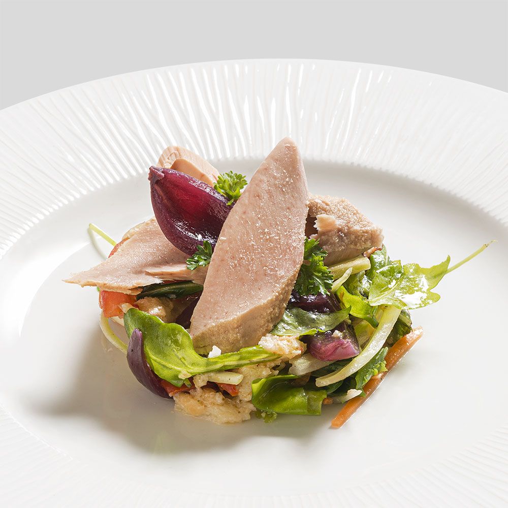 Put the drained bread, basil, celery, carrots, Riviera olives, sliced semi-dried tomatoes and sweet and sour red onion in a bowl, add a drizzle of oil and season with salt and pepper.