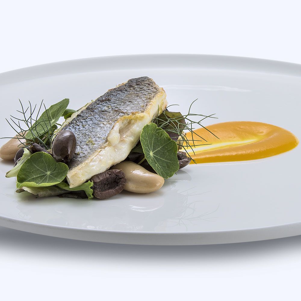 Drizzle the serving dish with the sauce. Arrange the salad greens and the fillet on the serving dish. Garnish with the Taggiasca olives.