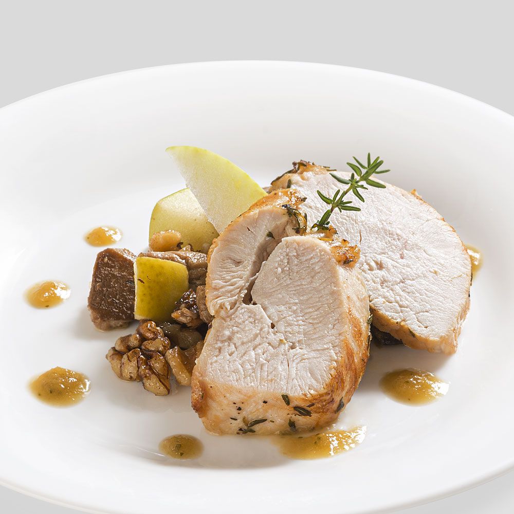 Cut the peeled apples into wedges. Season the chicken breast with oil, thyme and cloves. Caramelise in a non-stick frying pan and finish cooking in the oven at 145°, reaching 85° in the centre.