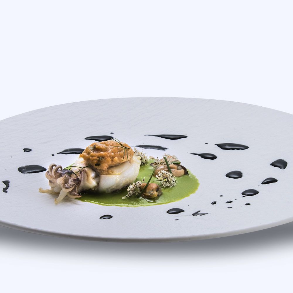 Serving suggestion: Spoon the courgette sauce into the centre of the serving dish, place the filled cuttlefish on top and garnish with the de-shelled mussels.