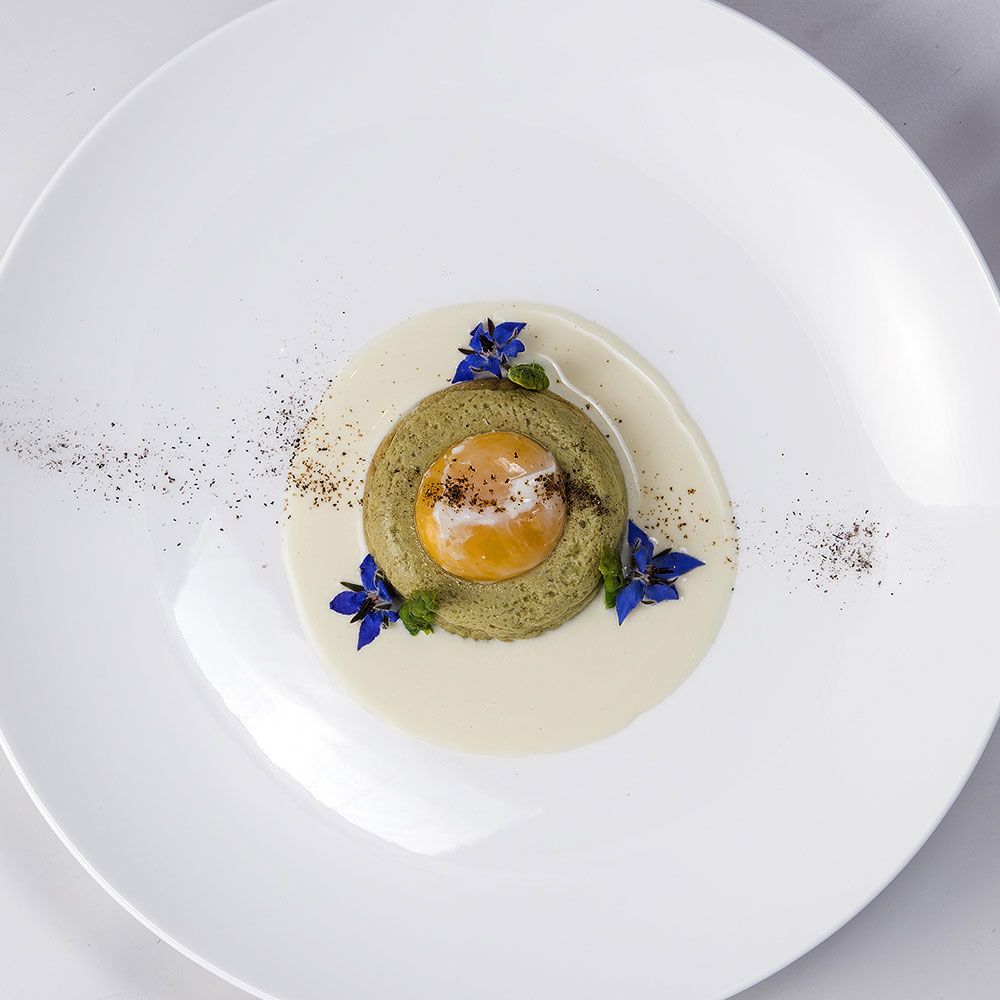 Pour the Parmesan sauce in the centre of a plate, arrange the flan on top and complete with the poached egg in the centre.
