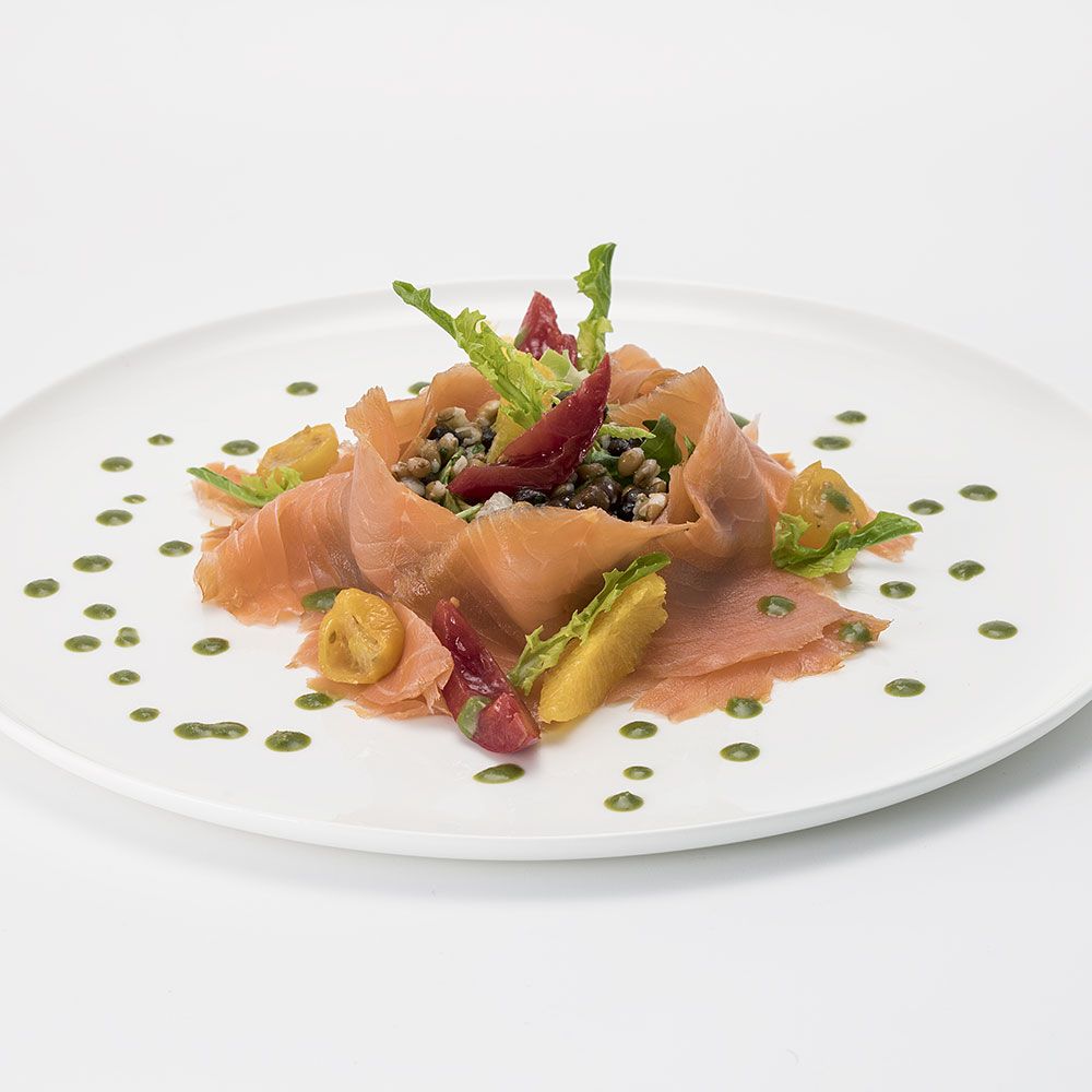Arrange the salad on the serving plate with the help of a food ring mould, arrange the salmon slices neatly and garnish with yellow and red cherry tomatoes.