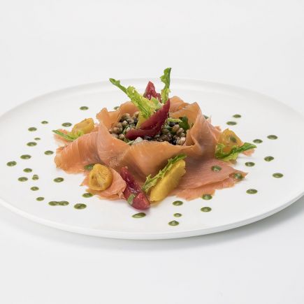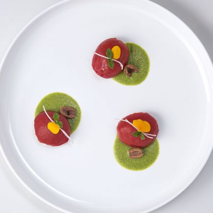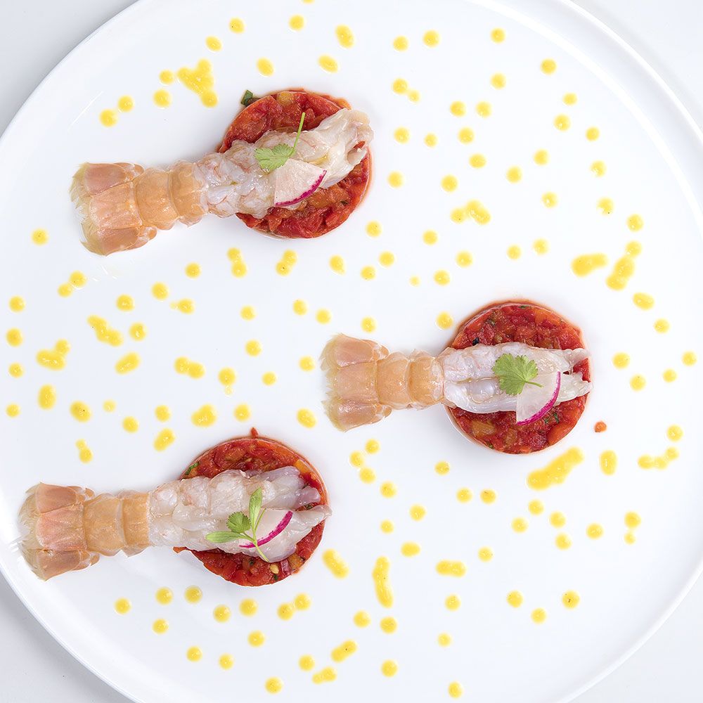 Abbattere gli scampi a -20 c° per 24 ore. Separare i Peperoni Grigliati gialli da quelli rossi . In un pentolino fare un soffritto leggero di olio EVO e scalogno, aggiungere i peperoni gialli, sfumare con qualche goccia di aceto balsamico e togliere dal fuoco. Regolare di sale. Frullare i peperoni gialli con un mixer ad immersione, fino ad ottenere una salsa densa e cremosa. Filtrare la salsa con un colino cinese e raffreddare a 3°C. Pulire gli scampi dalla loro carcassa e marinarli con olio EVO, sale, pepe e zenzero grattuggiato. Tagliare i peperoni rossi a julienne. Condire con sale, pepe, menta fresca e qualche goccia di aceto balsamico. In un piatto con l'aiuto di un ring adagiare la tartare di peperoni, porre sopra gli scampi marinati e guarnire con la salsa di peperoni gialli.
