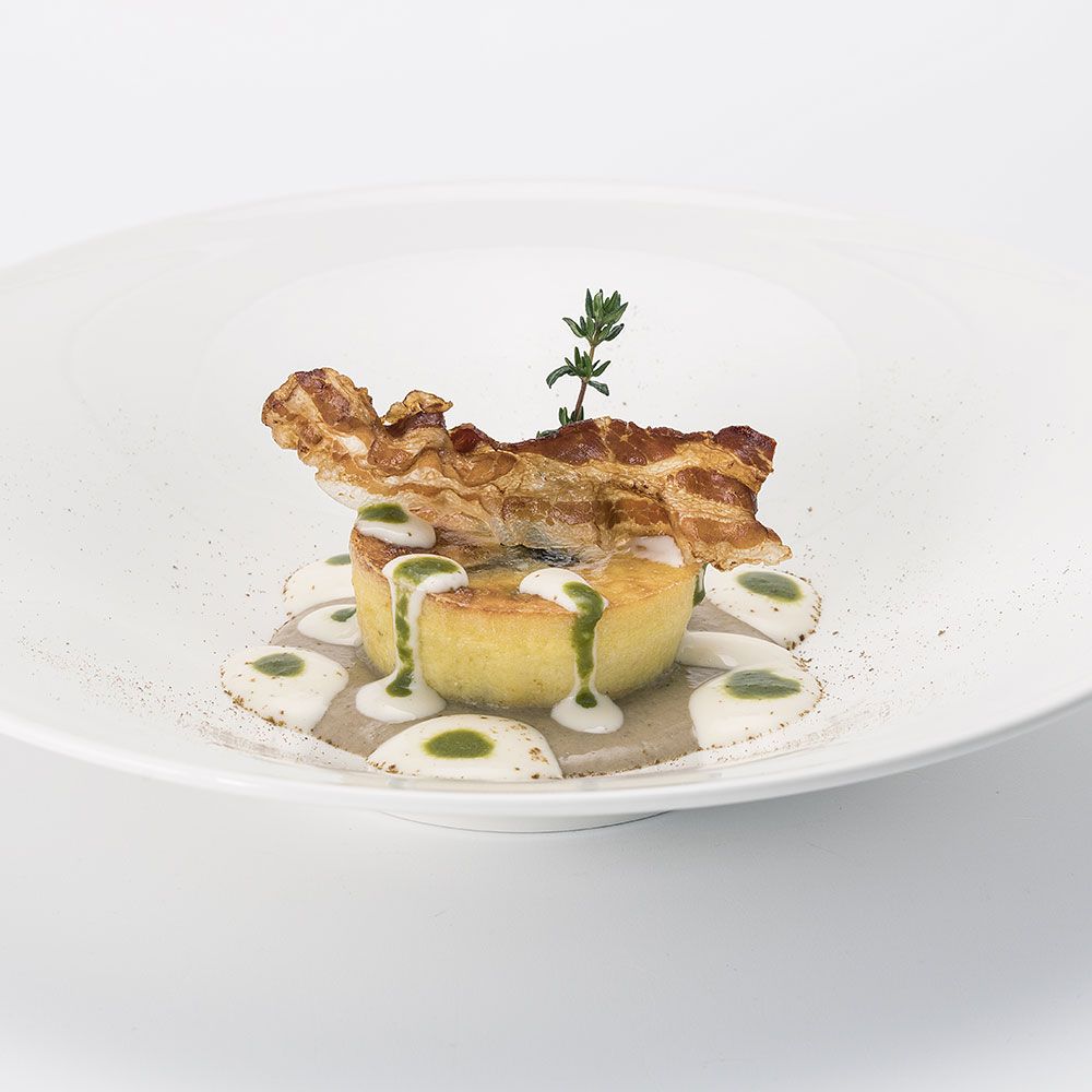 Dressare il piatto con la salsa di funghi e la salsa di pecorino, adagiare lo sformato caldo e guarnire con le chips di pancetta e una manciata di pepe.