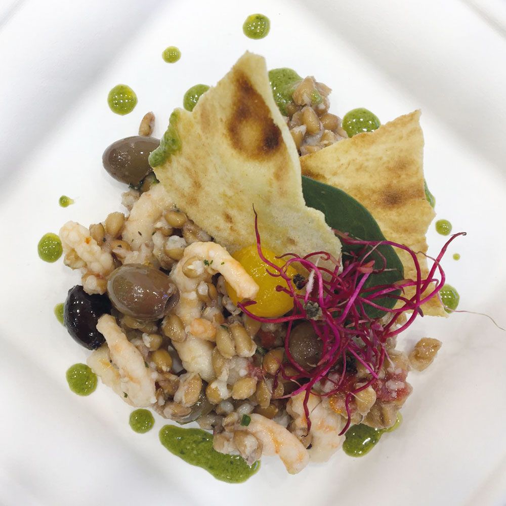 Mettere in un recipiente il Grano, il Farro, i Pomodori, le Olive ed i Gamberetti e condire con dell’olio evo, basilico fresco ed una grattata di limone